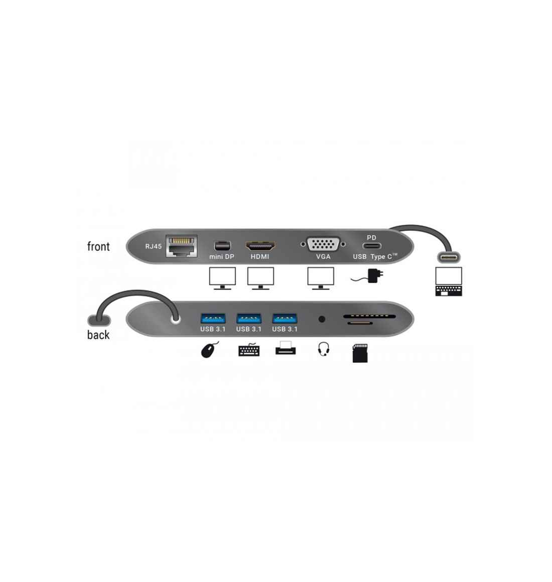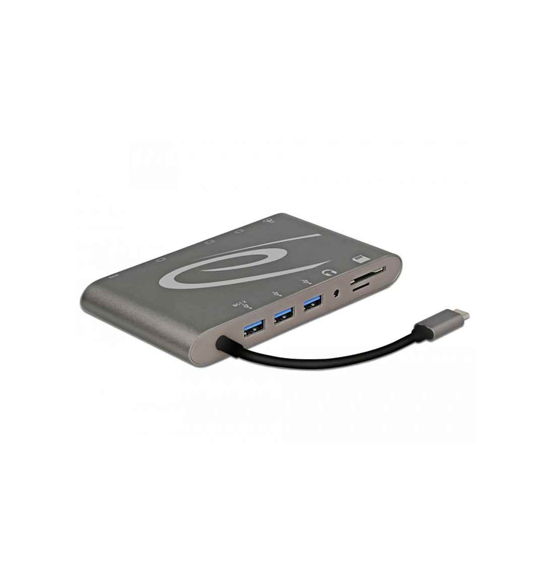 Diese Dockingstation von Delock kann an einen Computer mit USB-C™ Alt-Mode oder Thunderbolt™ 3 Port angeschlossen werden und stellt eine Vielzahl von Schnittstellen zur Verfügung. Am mini DisplayPort und HDMI Ausgang können gleichzeitig zwei Monitore betrieben werden, alternativ ein einzelner Monitor am VGA Ausgang. Drei integrierte USB Typ-A Ports ermöglichen die Verwendung von Peripheriegeräten, und Anschlüsse für ein Headset und Gigabit Netzwerk, sowie ein SD / micro SD Card Reader, vervollständigen die Ausstattung. Mit einem USB-C™ Netzteil können Notebooks wie das MacBook oder Chromebook während des Betriebs geladen werden.